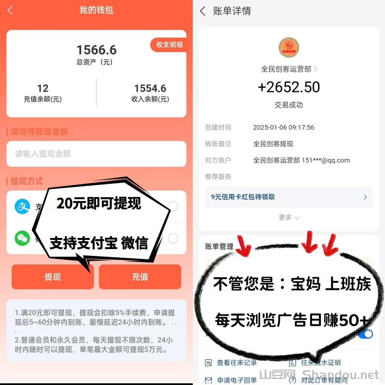 静态收入玩法:开通永久会员,每天签到和浏览10个广告,日赚50元,月赚最低1500元。