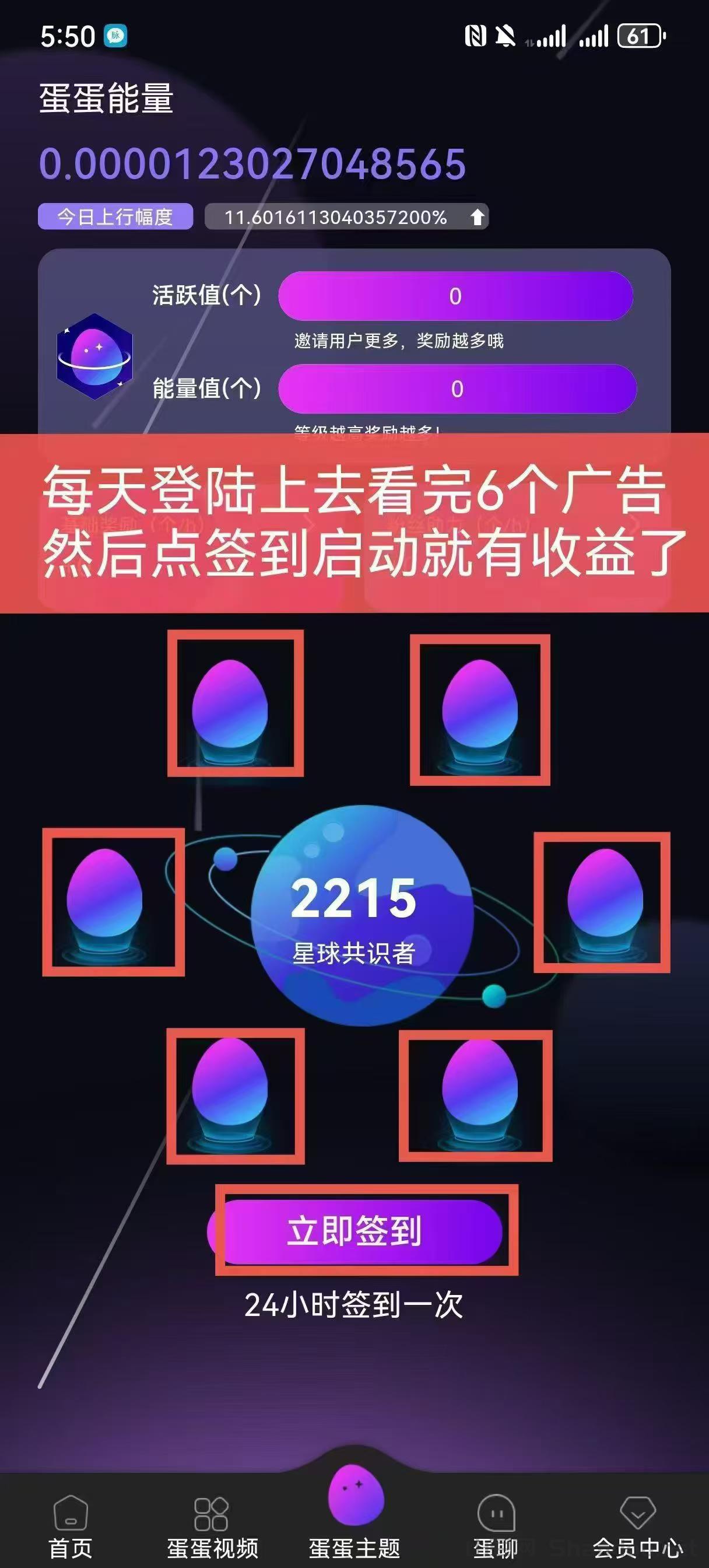 【蛋蛋星球】上线10几天,提线丝滑!现在经已涨了6倍了,一定要重视,一个圈圈涨了900多倍,纯蛋蛋0撸,每天看7告广个,能量每天在涨,速度玩,高产期,玩在现一天超期后过玩一个月!浏览器扫码
