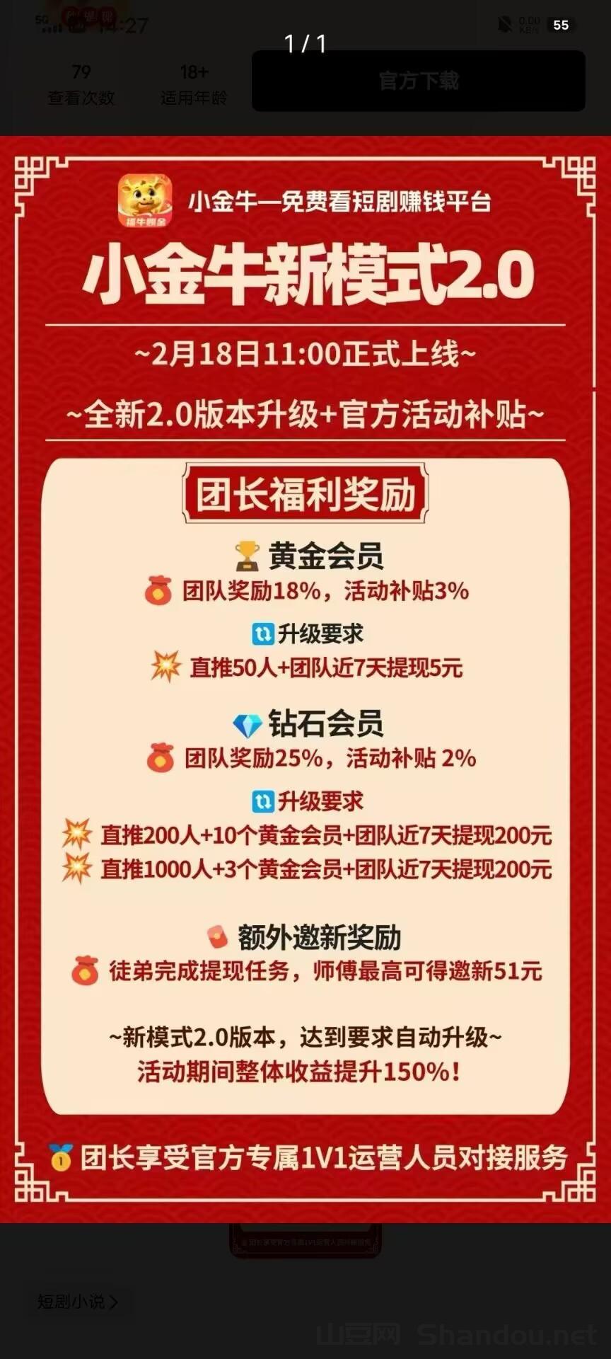 【小金牛短剧】广告单价0.2-1.5米,保底收益 首码已出 团长模式
