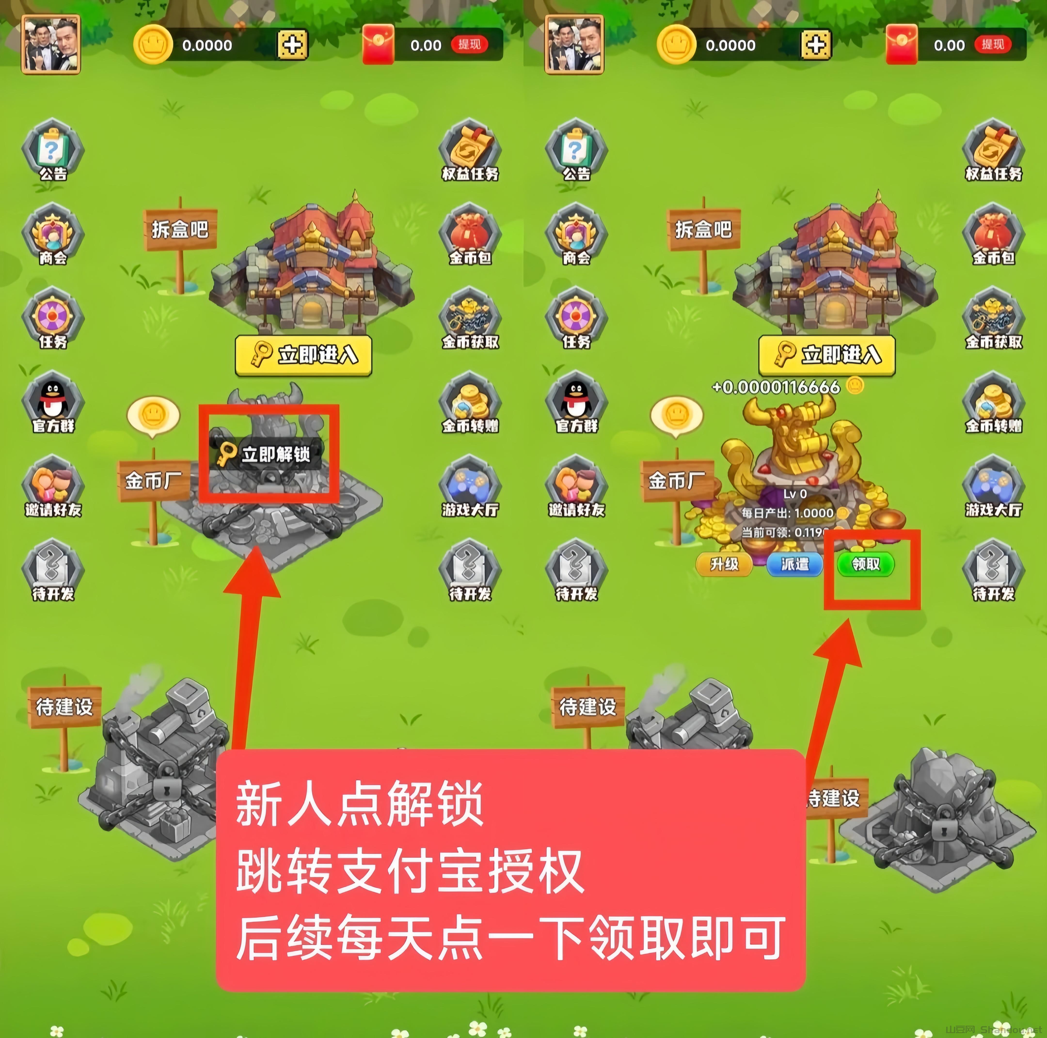 授权认证zfb,即可解锁工厂,每天产出1金币!