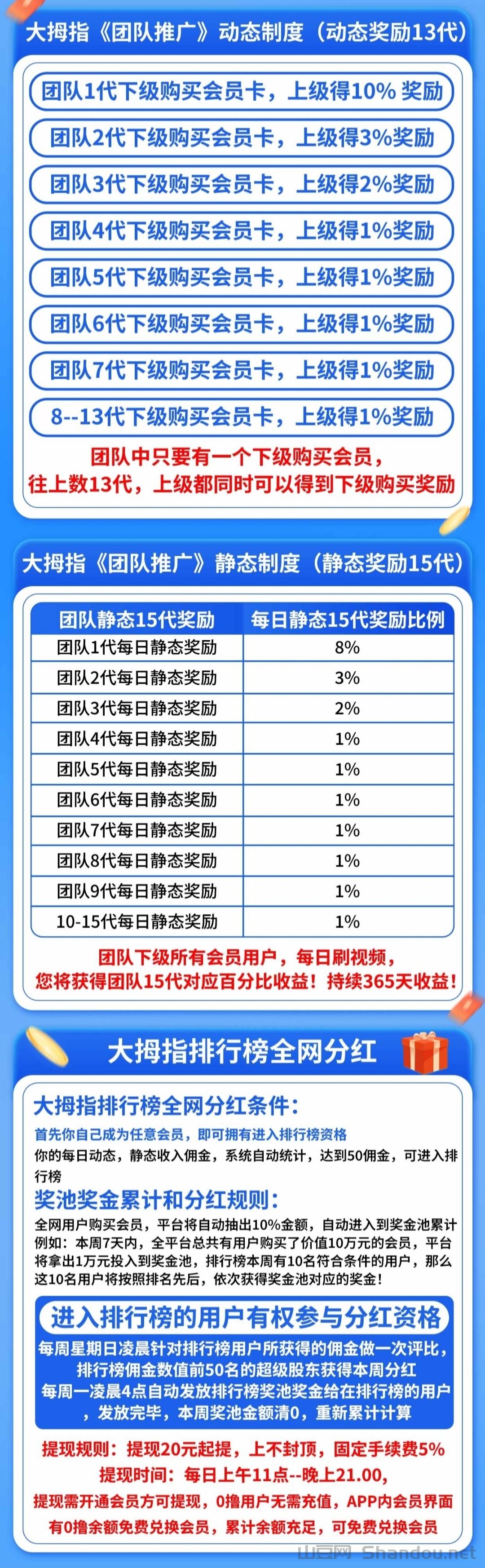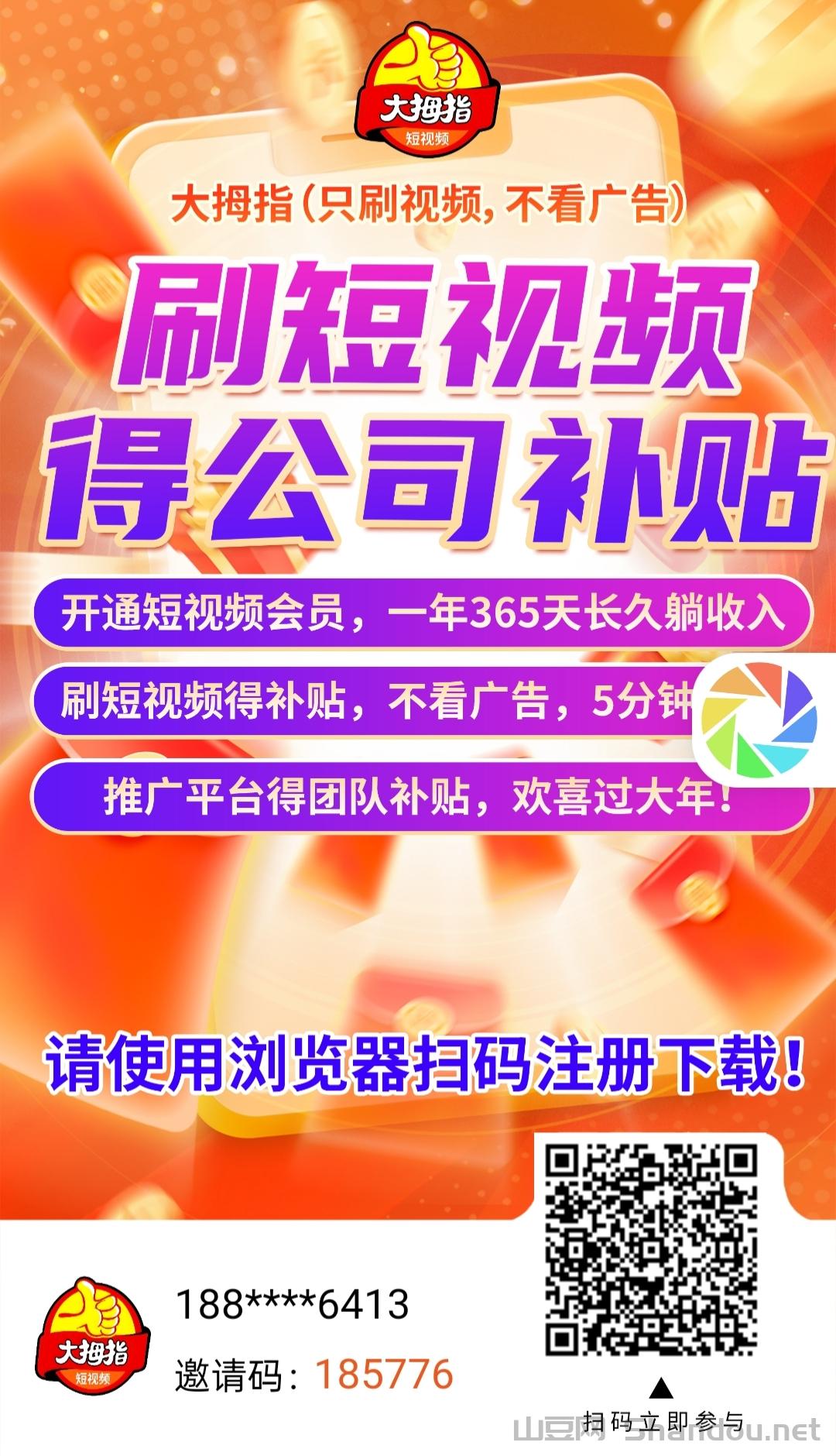 大拇指是刚上线的全新零撸短视频项目,主打稳定长久运营,适合各类玩家参与。用户每天观看视频5分钟零撸1元,无需投入,即可轻松积累收益。邀请成好友,每日观看视频视频5分钟零撸赚1元,您必得1元奖励,好友坚持每日观看视频零撸,您每日重复获得1元奖励,假设1000位好友每日观看短视频,您每日可得1000元奖励,以此类推无上限获得奖励。
