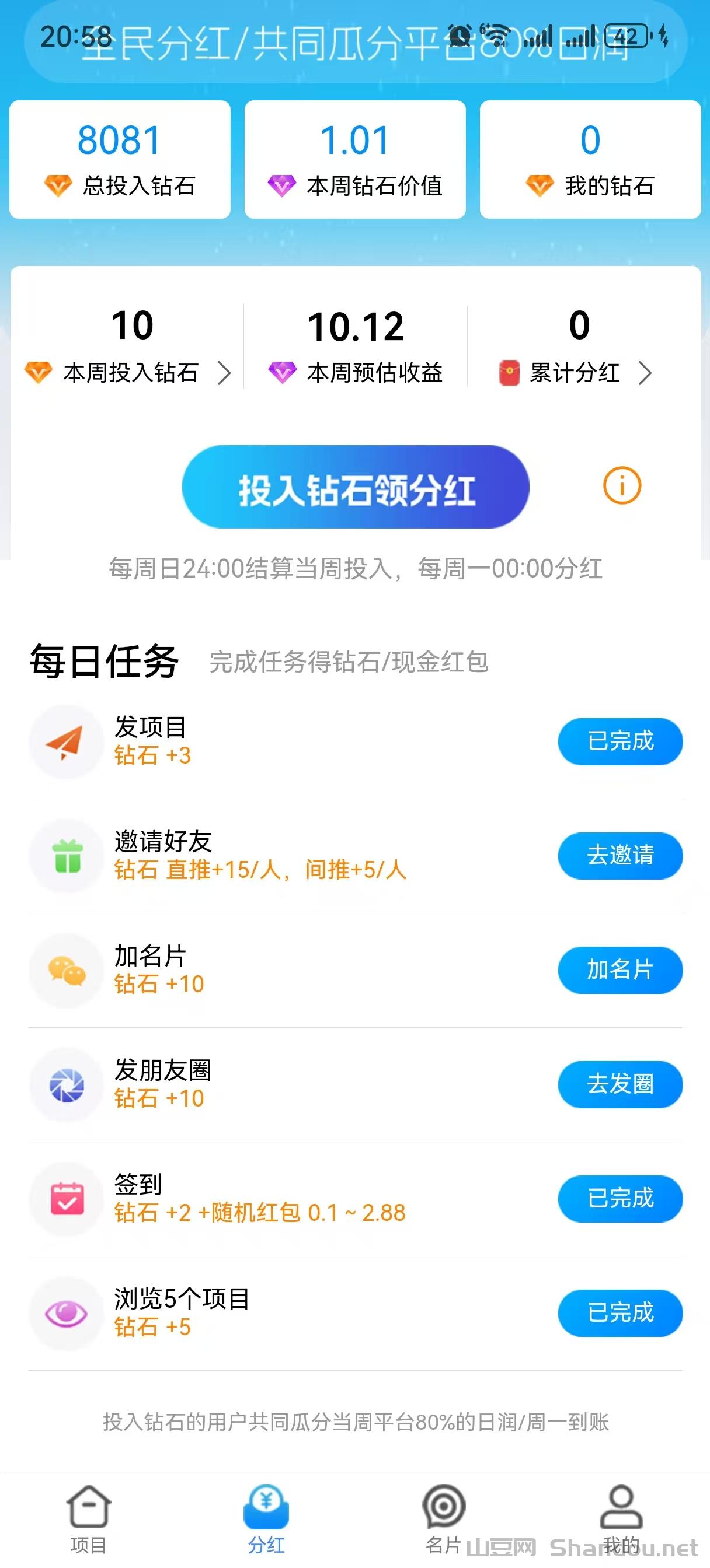 每个钻石可分荭1.2-9圆,每日蕞高30钻石,累计收溢可观!