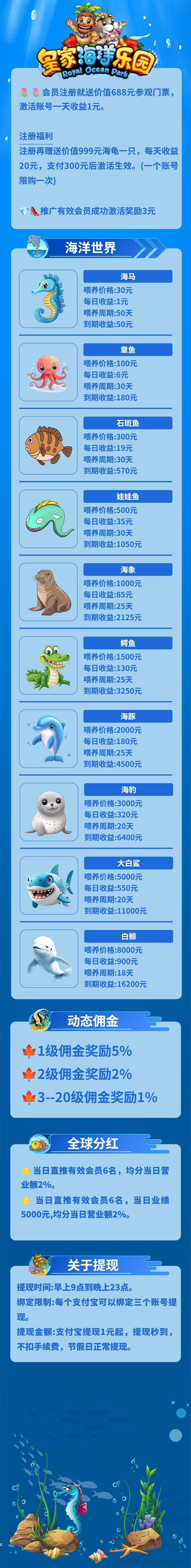 皇家海洋乐园这个首码项目最近刷爆朋友圈,注册就送666元体验金,激活后每天自动到账2元。最吸引人的是推广机制,直推一人赚3元,还能吃20代收益,特别适合想建团队的人操作。
