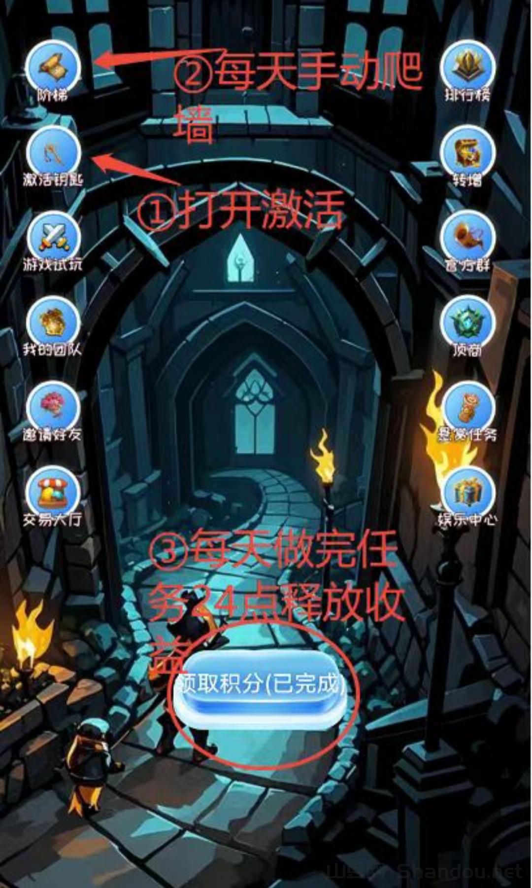 黑色城镇零撸,多样化,收益玩法,用户简单实名后获得激活卡爬阶梯,每日看6个广告释放爬墙奖励,做完后可额外得0.5个积分,每天凌晨自动产出爬墙积分,最高可爬墙到56级阶梯