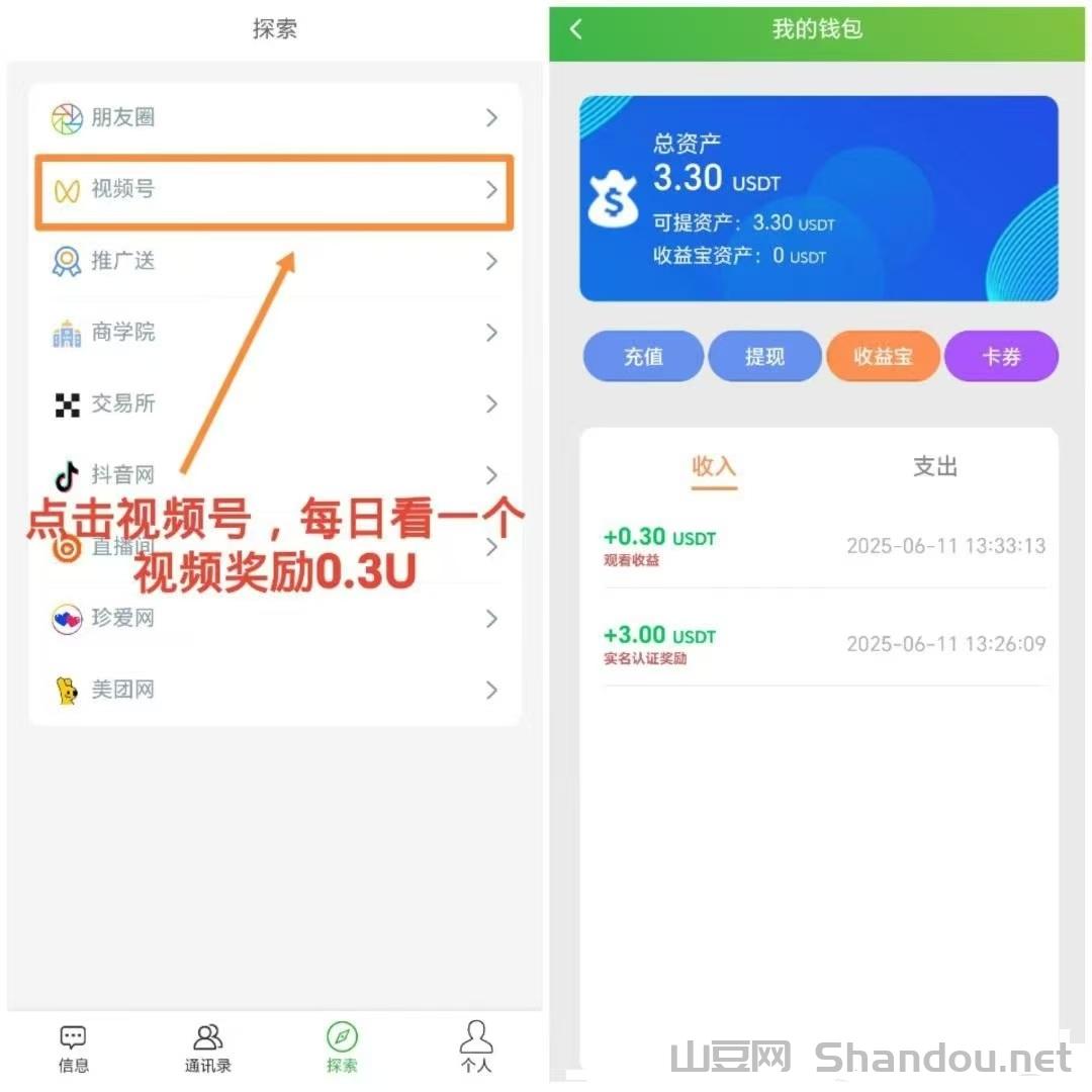 每日看一个视频奖励0.3U