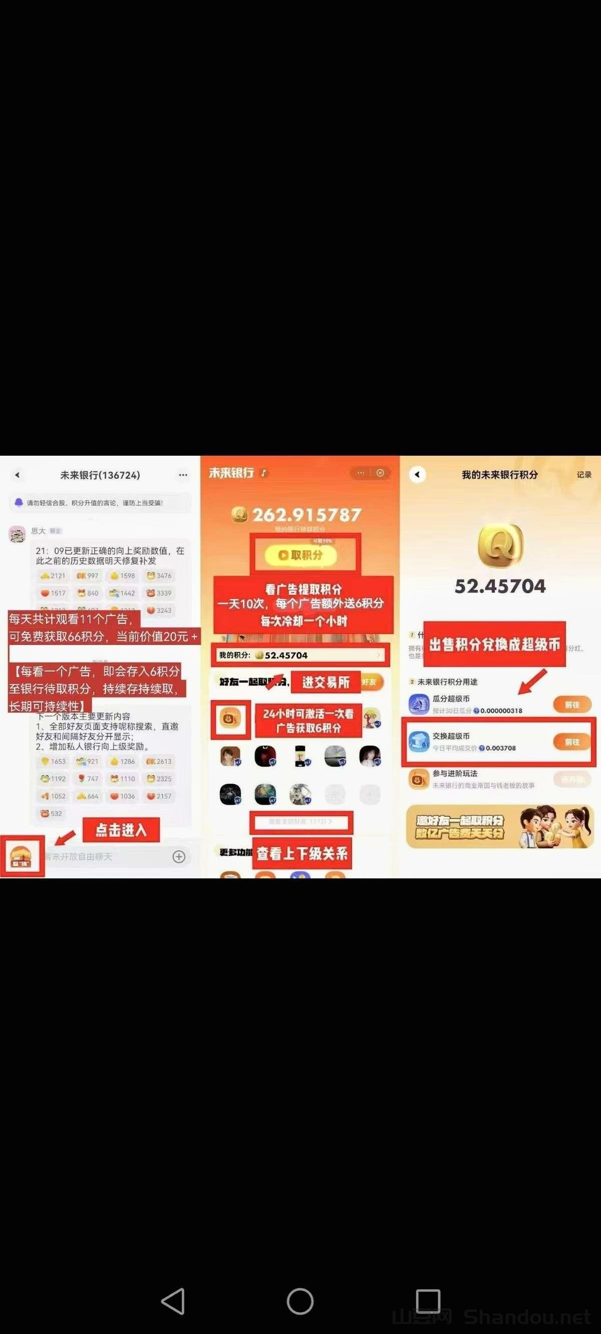 注册下载超级链接,用超级链接扫未来银行二维码进群,在未来银行群板块看广告领取积分,第一天可以出掉160积分=25米,后续每天11个广告66积分!