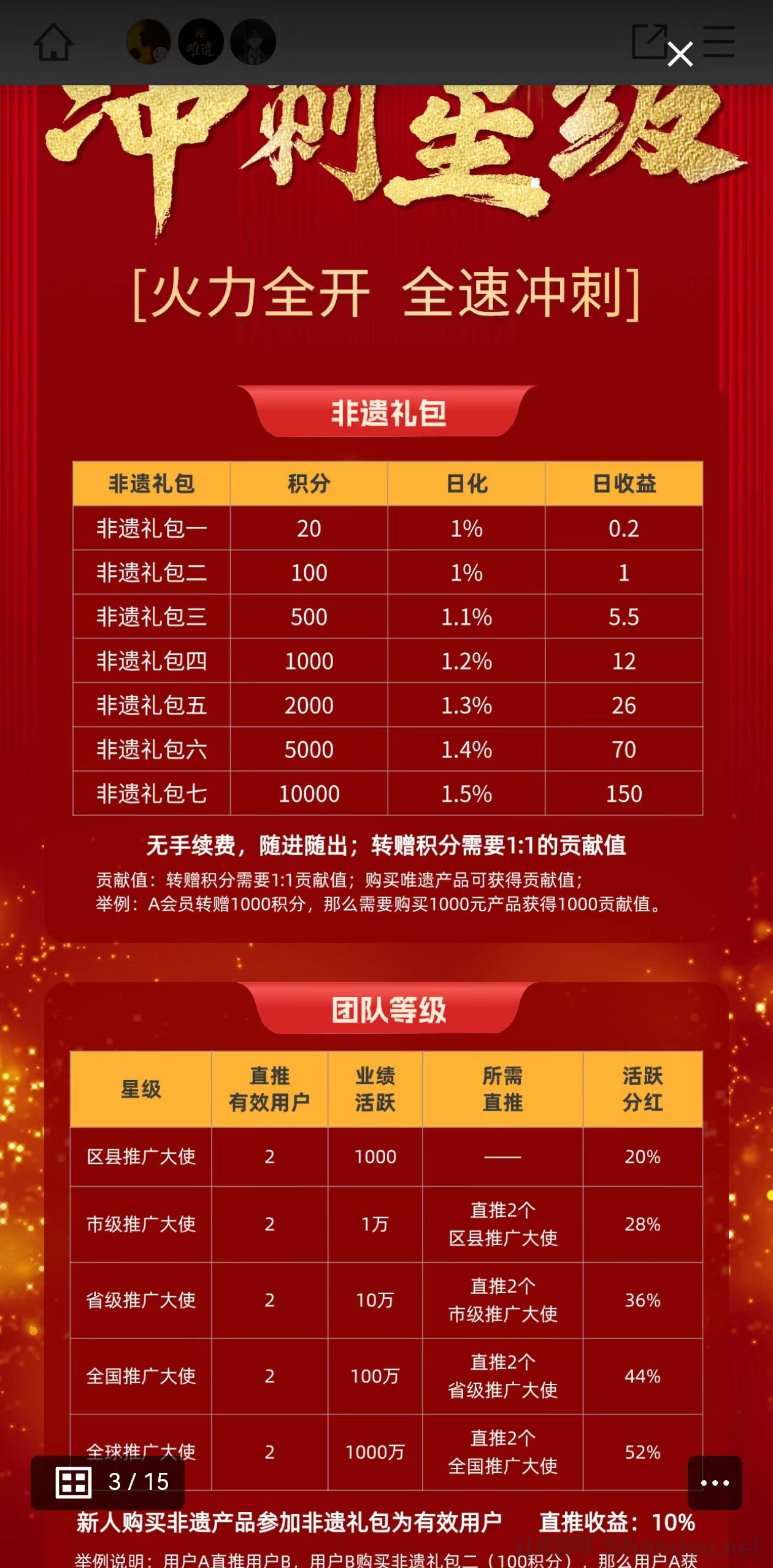 为了让用户获得更多收益,唯遗还设立了五级推广大使体系。根据团队规模和业绩,推广大使最高可获得52%的收益分成。随着团队的不断壮大和业绩的提升,推广大使的等级也会逐步晋升,享受更高比例的收益分成。例如,五星推广大使可享5倍收益加速,这无疑为有能力和资源的用户提供了广阔的发展空间,让他们在推广非遗文化的同时,也能实现自身的经济价值。