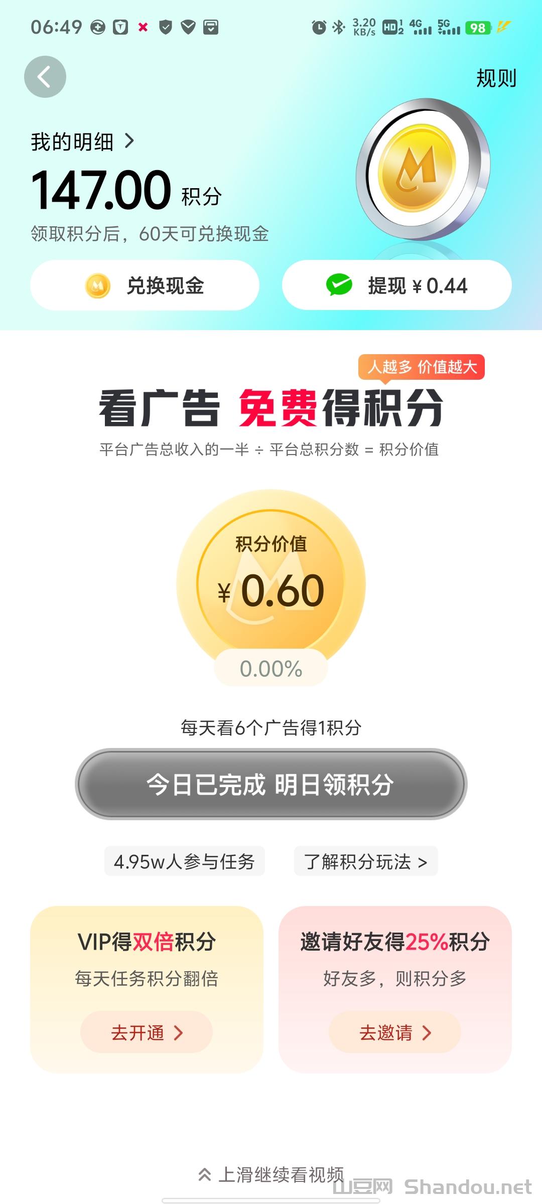 每天六个广告完事,第二天领取积分奖励