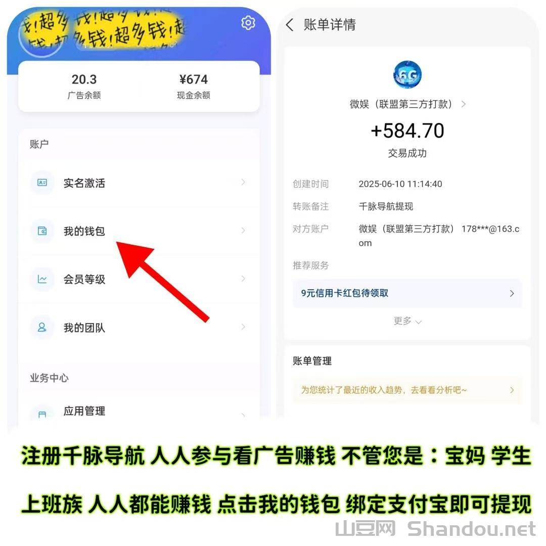 月赚6000+,千脉导航,看视频广告赚钱,只需实名激活,包赔包赚,每天保底20元,每月保底600元,广告余额5元起即可提现。