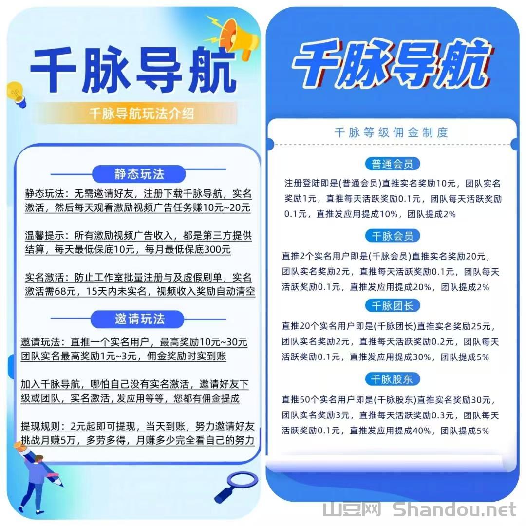 千脉团长:直推20个实名用户,自动升级,直推实名激活奖励25元,团队实名激活奖励2元,直推发应用提成30%,团队提成5%。