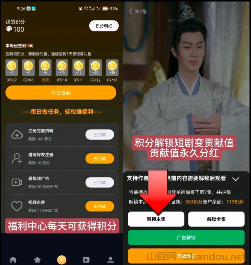 通过每天签到、看广告,视频点赞等方式来获取积分,积分用来解锁视频后自动兑换成贡献值,消费多少积分增加多少贡献值,