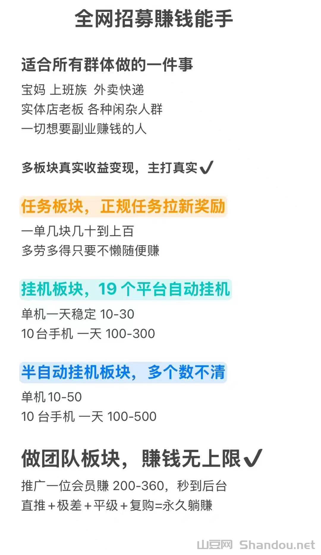 做推广团队收益轻松月入1-30W,直推奖+极差奖+平级奖+任务极差+任务平级+复购奖等,多种佣金拿不停。