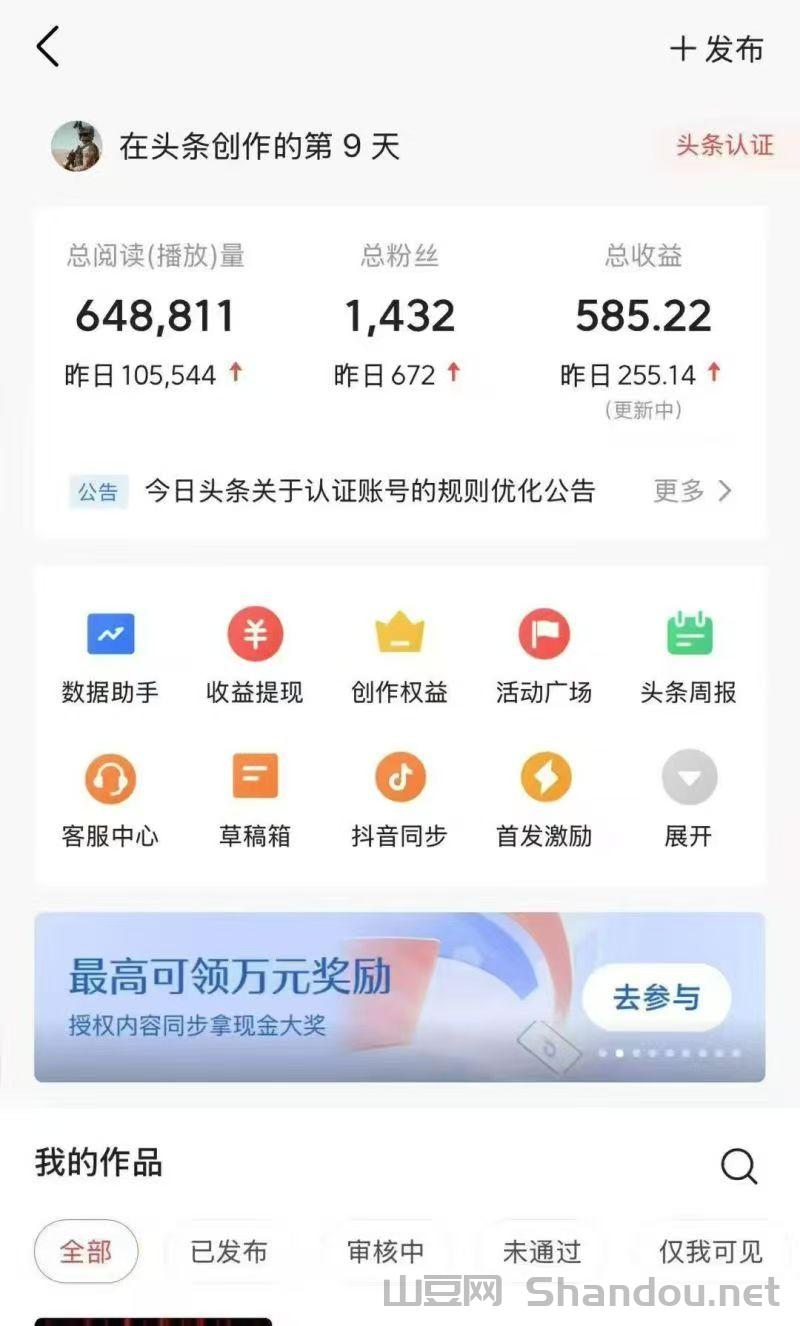 今日头条零撸平台免费提供视频,大家记得坚持发视频,外面几百几千的项目来我这免费。平台提供视频你只需要把视频保存下来发到头条号即可,55分成,保存图片微信扫码注册填写邀请码6573。然后去授权头条号,完了领视频发布就行了,推广好友来发还能赚佣金,无限代提成
