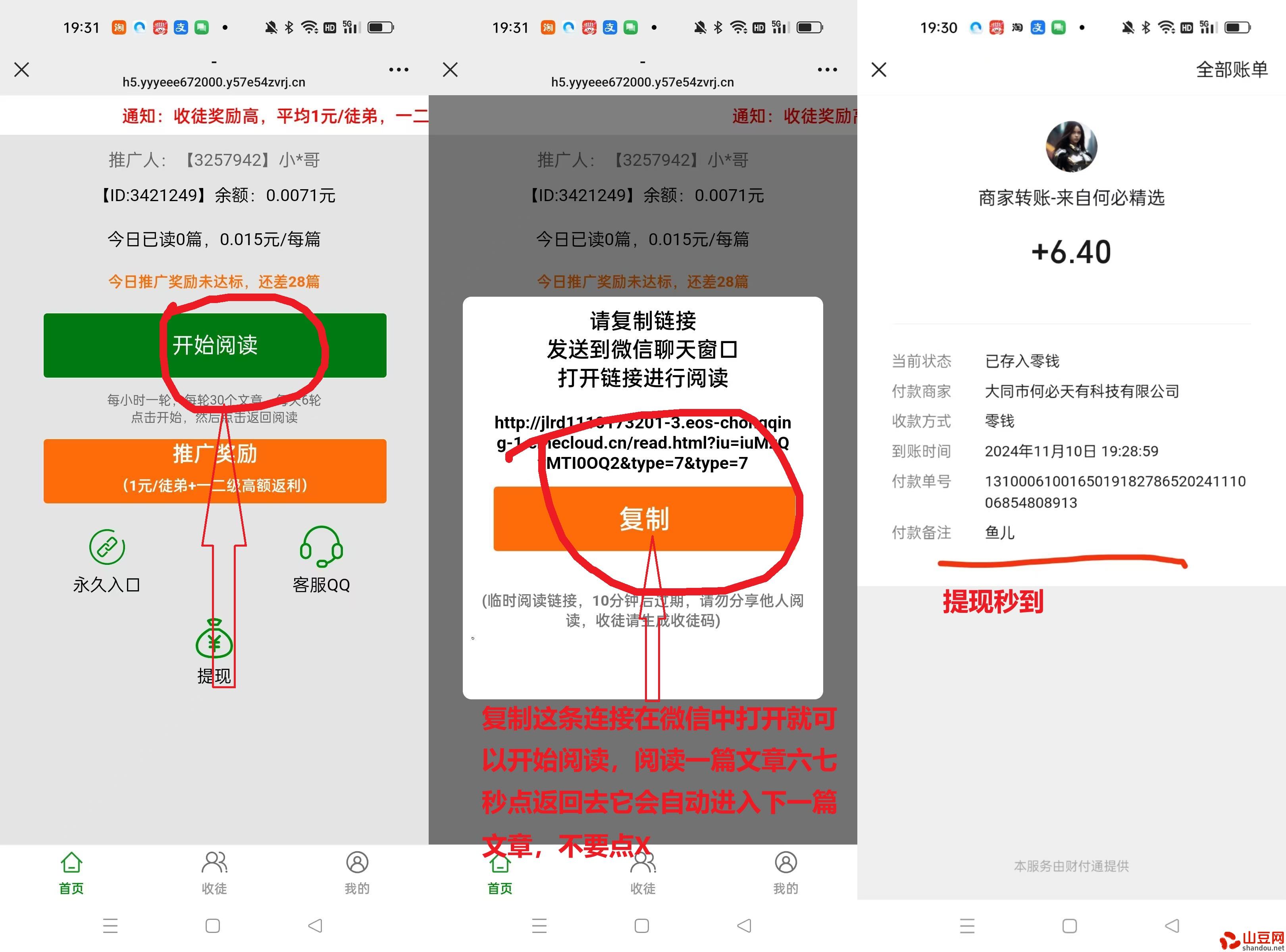 这个鱼儿阅读是新上线不久的平台,目前的单价是0.011元/篇(有时是0.015元/篇),满0.30元提现到微信,秒到账,每天可提10次。该平台的细节方面做得比较贴心。