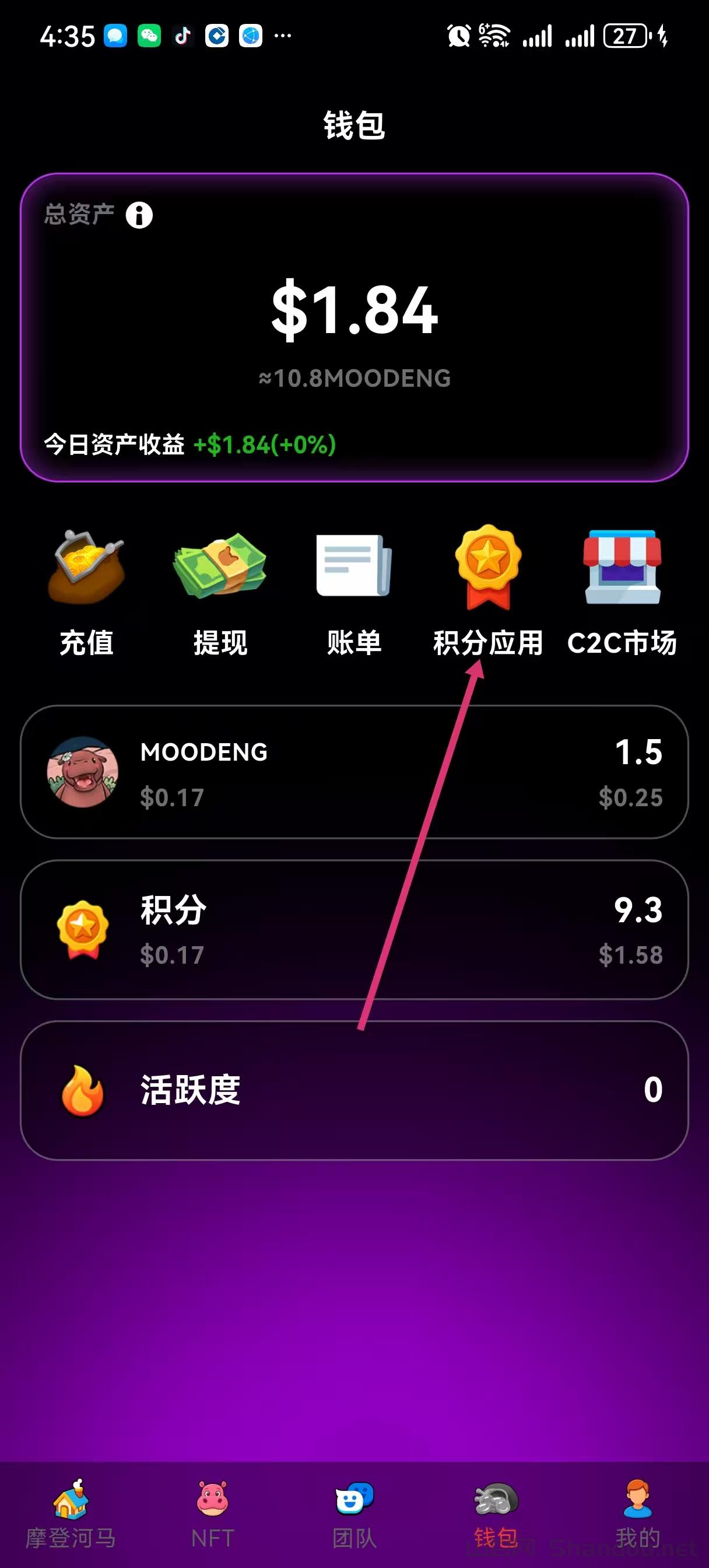 1 只「呆萌河马 NFT」(每日产出 10 积分,持续 365 天)