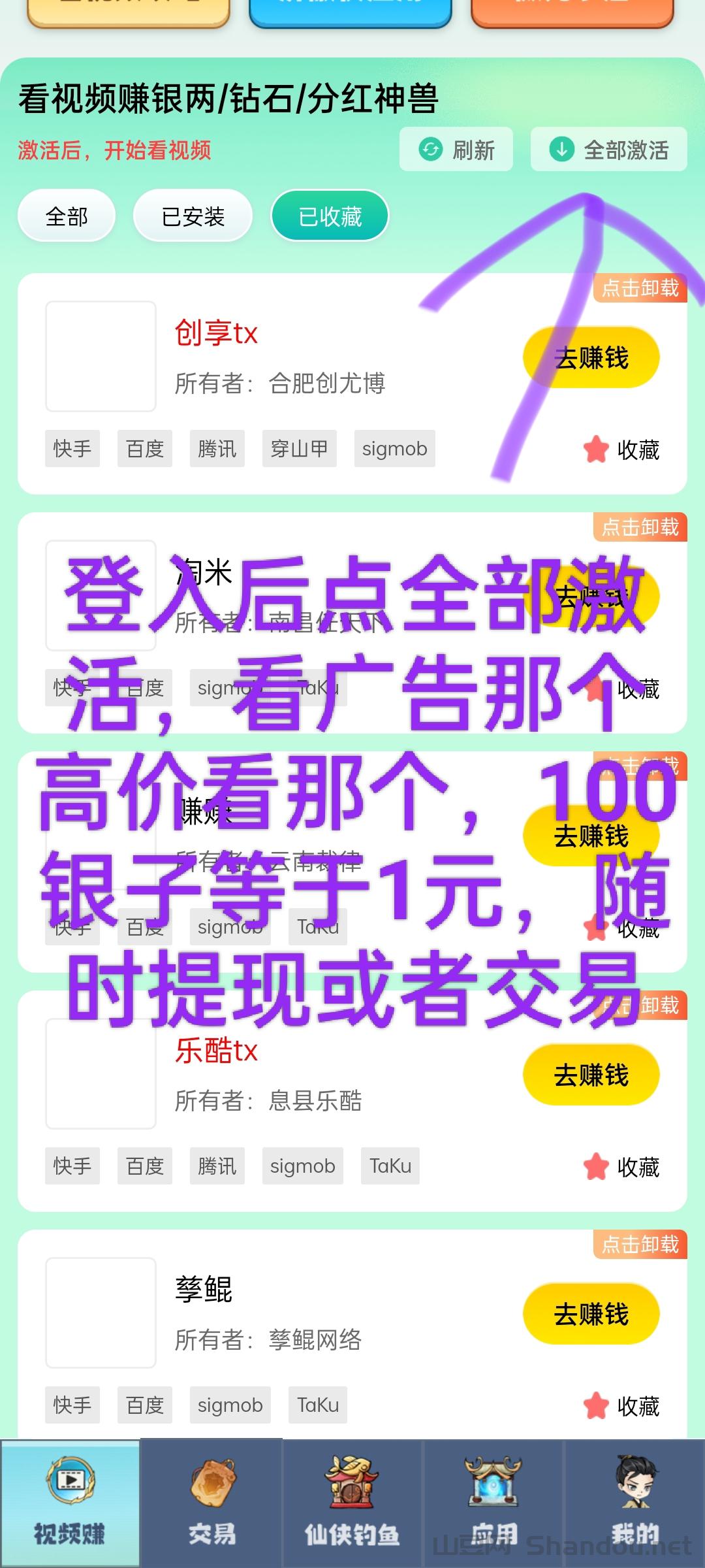 第二,点击看广告,先把全部应用下载,应用很小45mb,然后一个一个去试那个给的银子多看那个,100银子就是一元