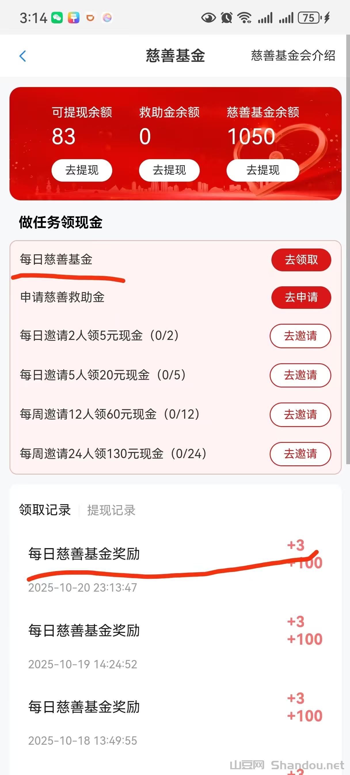 用户只需进入“我的/慈善基金”领取现琻,积分在“首页/每日签到”获取。