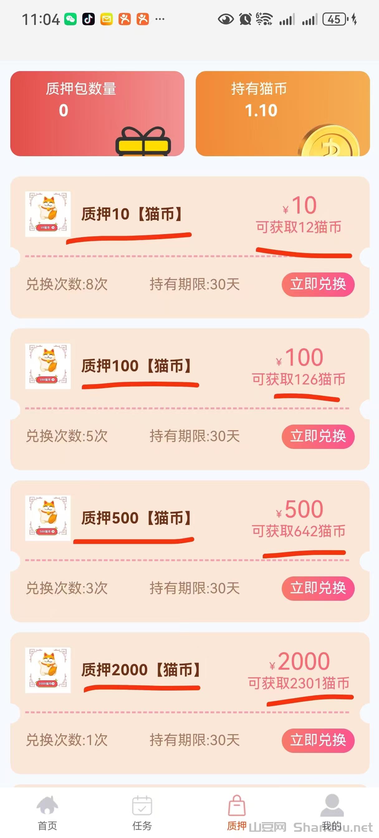 任务每天获得1个,最少5.5个互转,市场无限收猫b