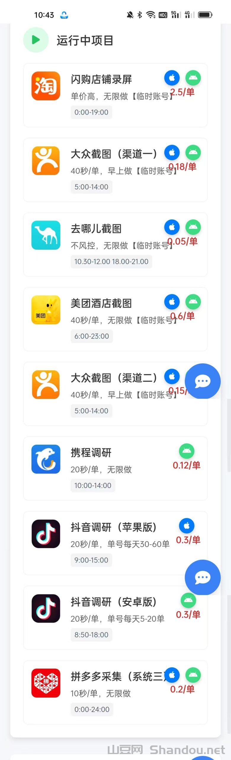 平台提供淘宝闪购录屏、大众点评截图、去哪儿网截图、美团酒店截图、携程调研、抖音调研、拼多多采集等多种任务,涵盖多个热门平台,任务种类丰富。
