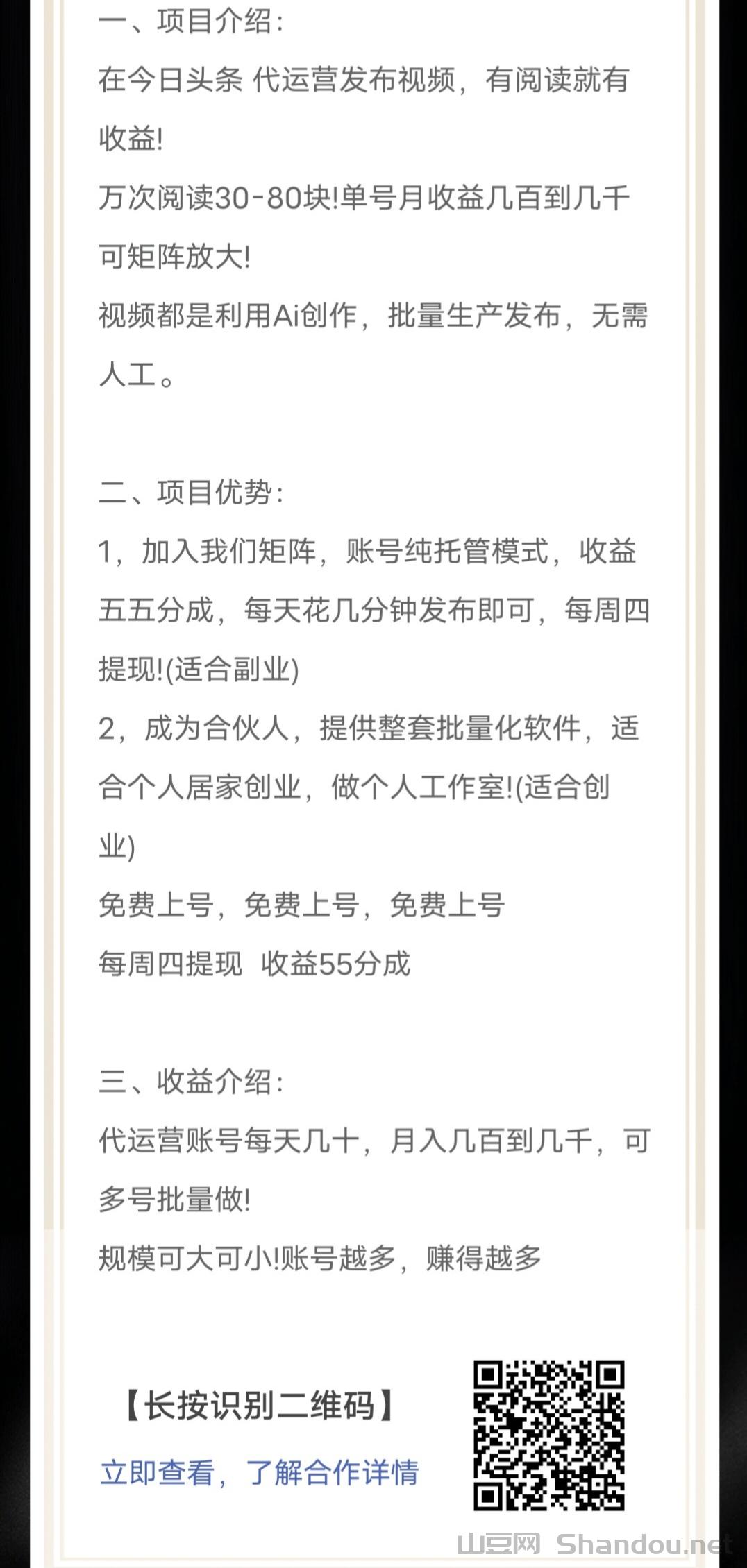 1,加入我们矩阵,账号纯托管模式,收益五五分成,每天花几分钟发布即可,每周四提现!(适合副业)