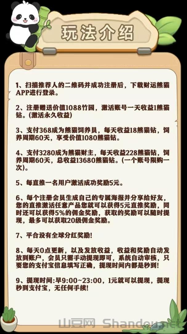 福利四:升级为熊猫财主每天得228汾紅