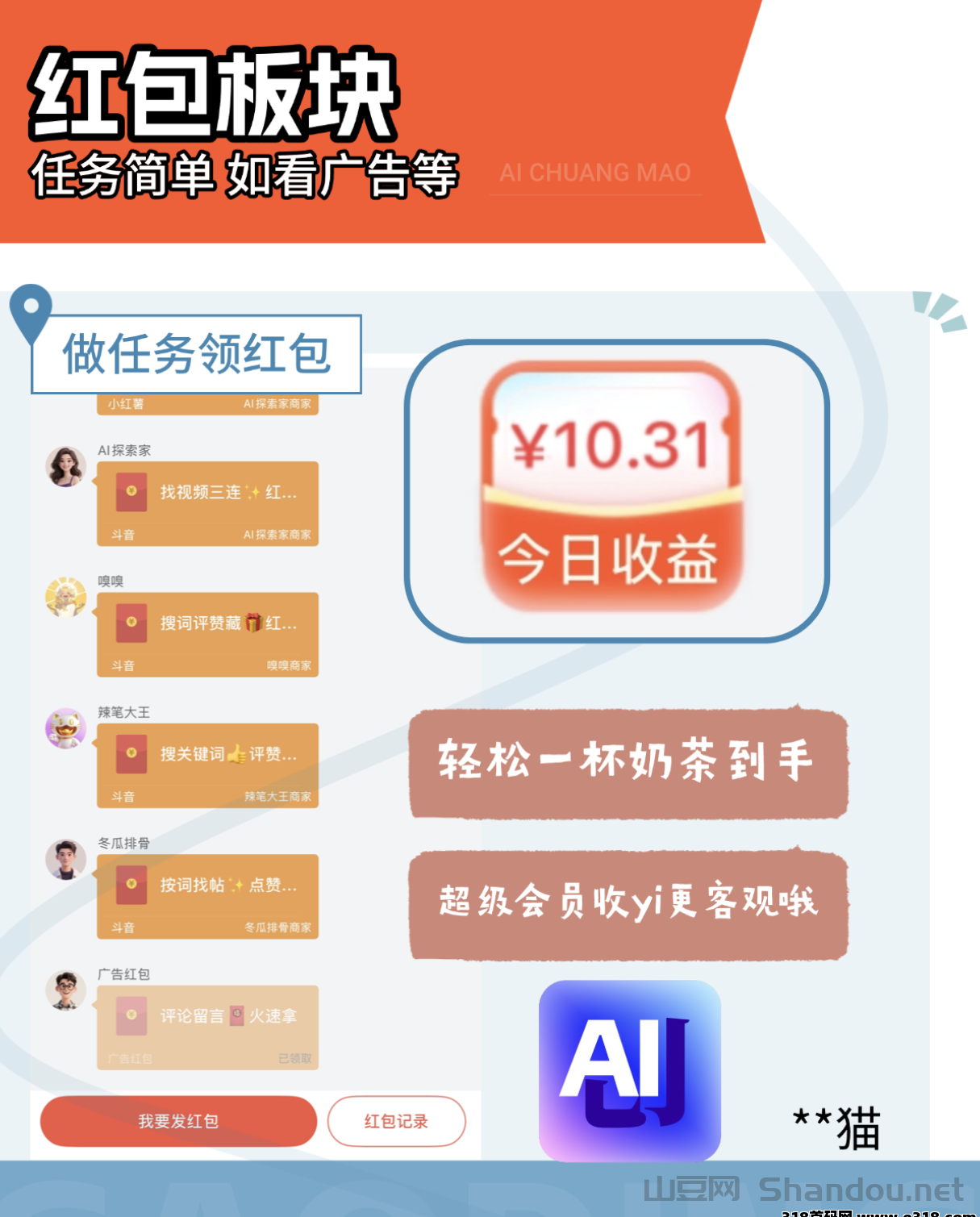 爱创猫视频种草平台,每天发3次视频,AI种草发视频奖励3元/条,还有ai带货,分享直播赚,看广告等等小任务,根本挣得停不下来,满2起提米,快来加入试试吧。