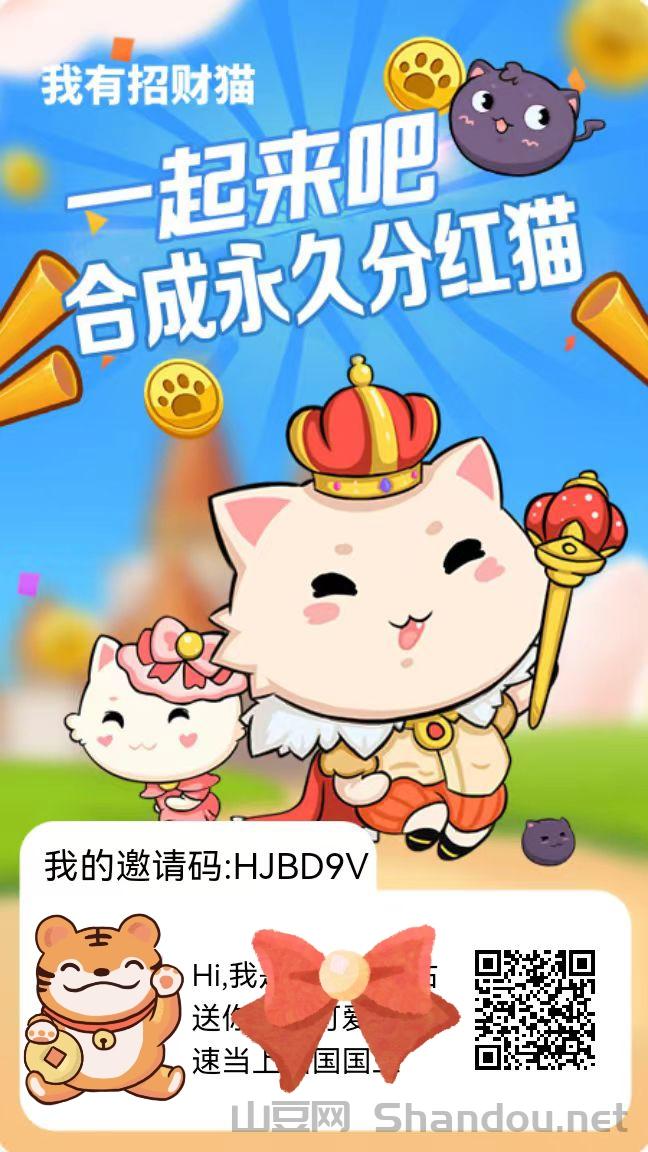 我有招财猫小游戏首码:合成38级永久分红90%广告收入秒提