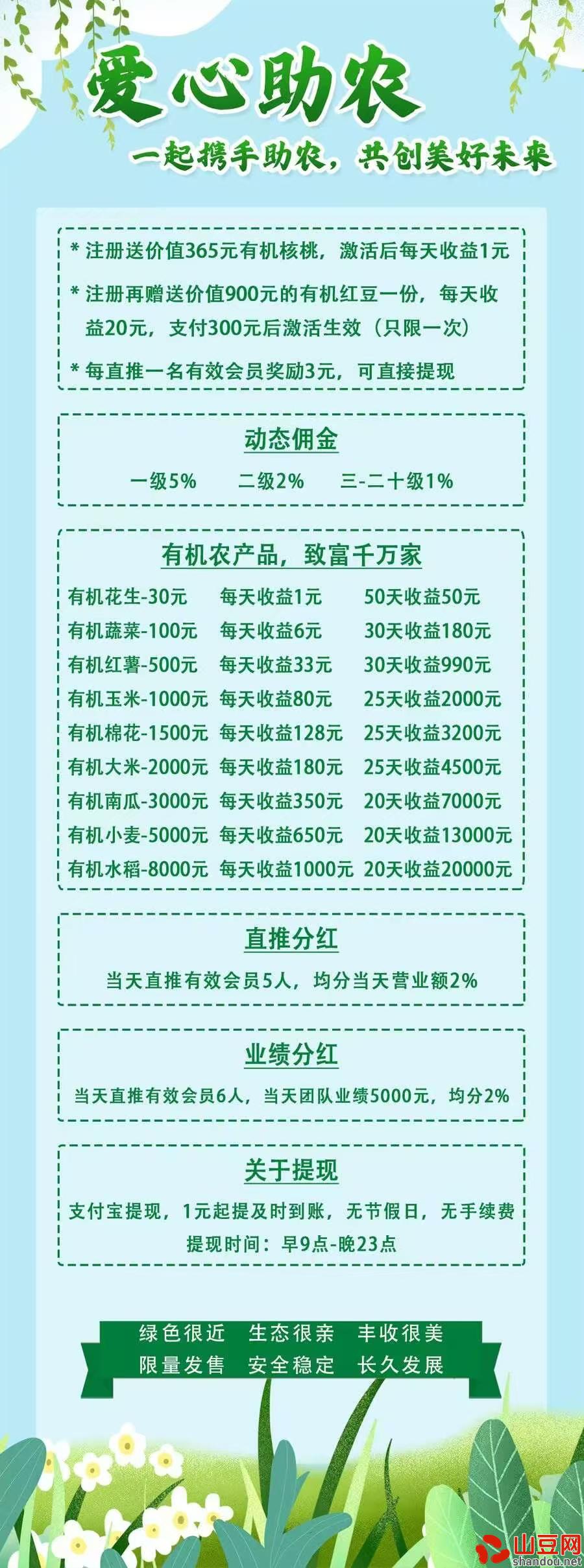 刚出一秒《爱心助农》躺赚,注册送365元核桃,红豆,自动收益,1元起提秒到