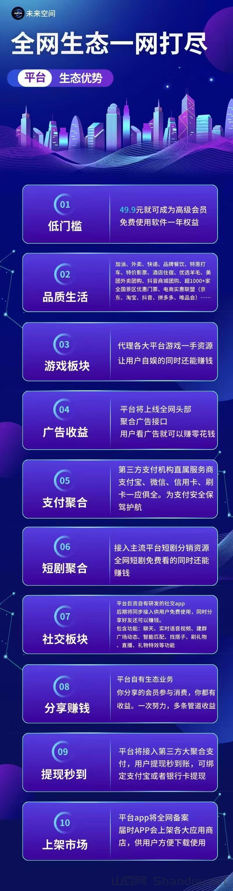 主打大生态平台,集众多板块为一体,涵盖生活中,衣食住行用吃喝玩乐,社交,广告任务,游戏板块,支付板块,多元化生态体系。让哽多会员参与使用软件,省钱同时还能做任务赚钱