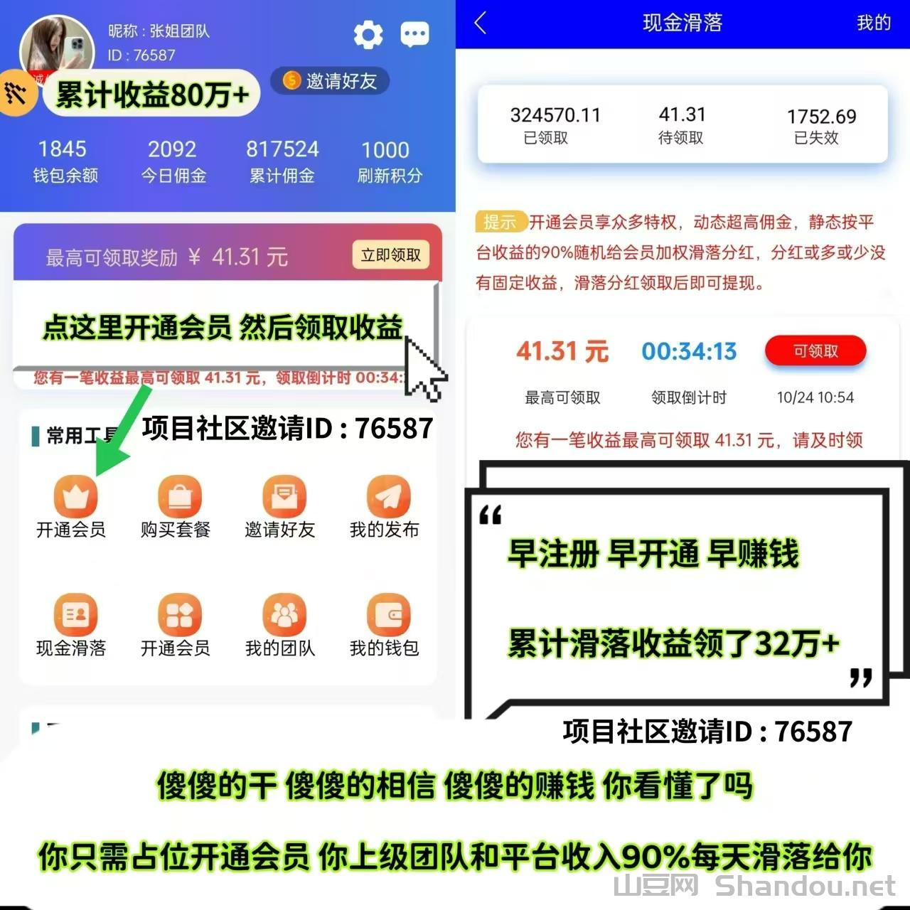 欢迎加入我团队,现在我总收入80万+,静态滑落收入32万+,我团队几十万人,我所有团队收入,系统每天自动滑落给你。