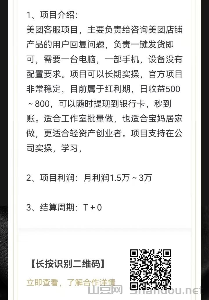 美团客服项目,主要负责给咨询美团店铺产品的用户回复问题,负责一键发货即可,需要一台电脑,一部手机,设备没有配置要求。项目可以长期实操,官方项目非常稳定,目前属于红利期,日收益500~800,可以随时提现到银行卡,秒到账。适合工作室批量做,也适合宝妈居家做,更适合轻资产创业者。项目支持在公司实操,学习,