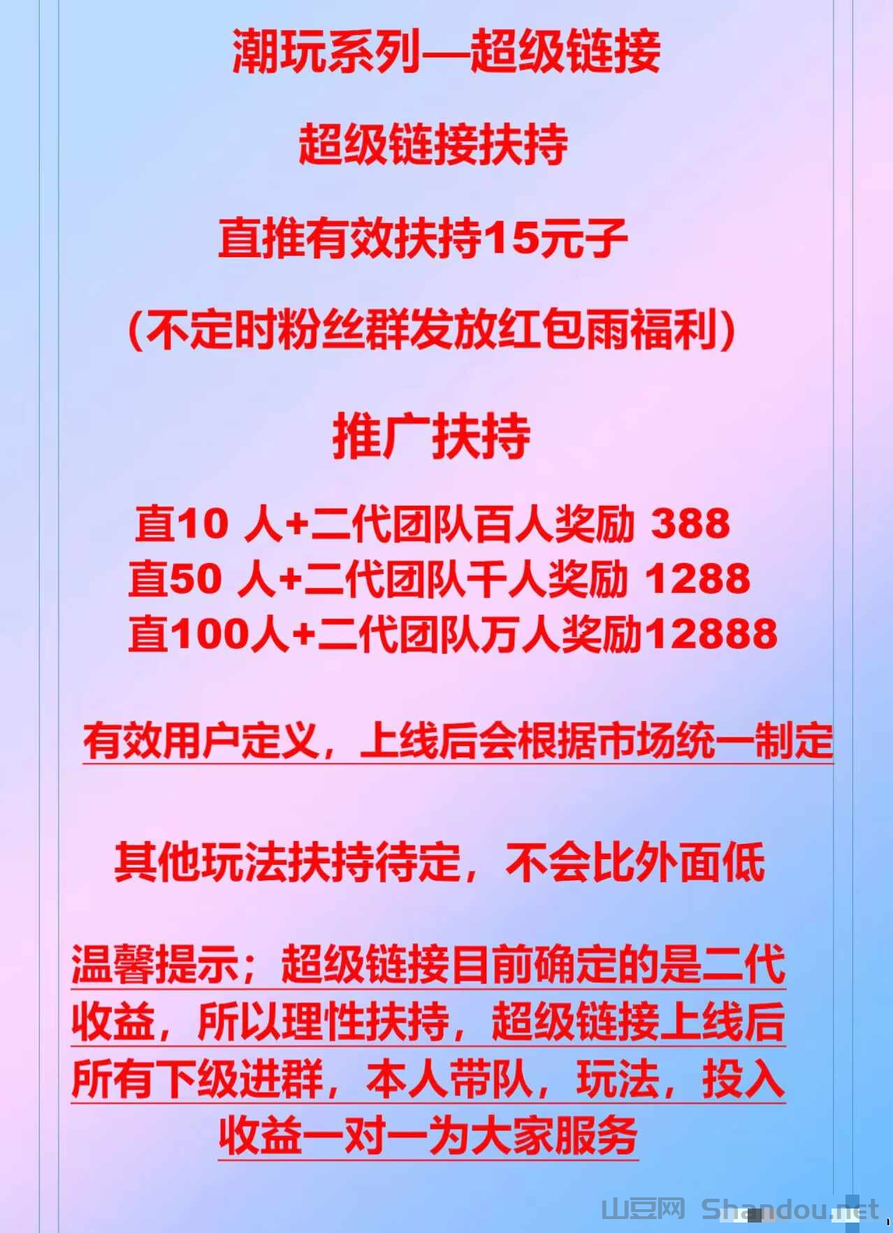 《超级链接》为啥这么火?是因为超级链接是蜂群联盟旗下app,不说别的,就一个潮玩宇宙会员量就是几百万,方块兽也是百万会员,这么大的流量,能不火么?尤其是前年做潮玩宇宙、去年做方块兽的团队长,基本都是大赚特赚,这次超级链接上线,还是从新锁定上下级关系,所以各大团队长,也是猛足了劲,争取这波一定要吃肉。通俗的讲超级链接就是项目⭕的微信,可以交流,可以发圈。以后优质的橡木都会上超级链接,网赚人可以更直观的挑选自己喜欢的橡木
